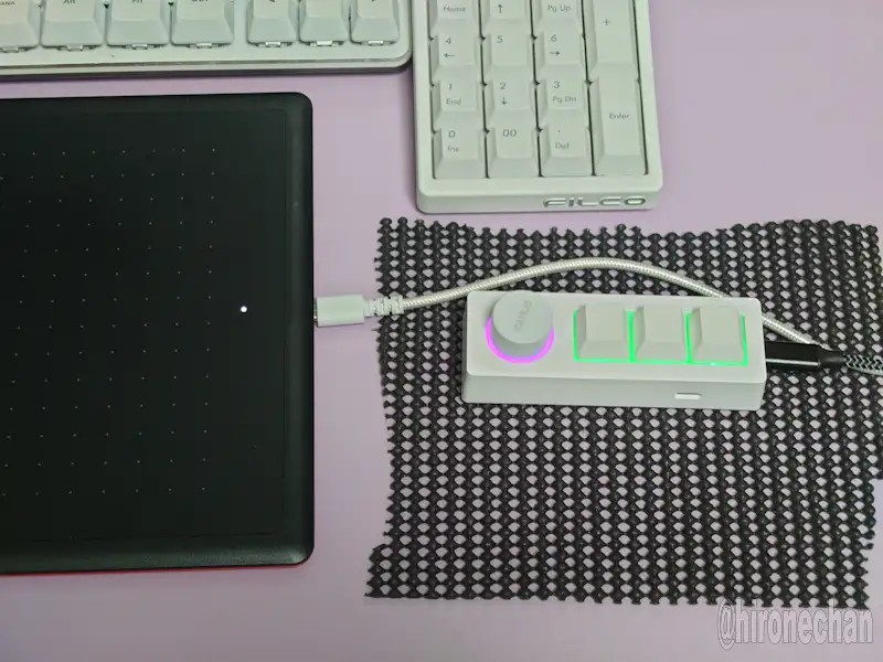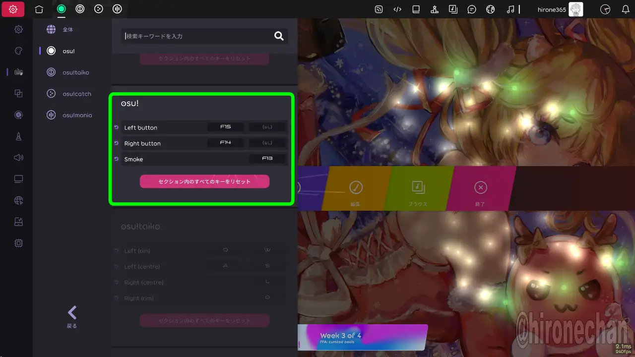 osuは2ボタン操作ですが、osu!lazerだと1つのボタンに2つまでキー割り当てできるので、テンキーのときに「人差し指・中指・薬指」の3本で割り当てて、それとは別にスモークでもう1つキーを割り当てていたので、ミニキーボードは3×2の6キーのほうが良かったかもしれません。