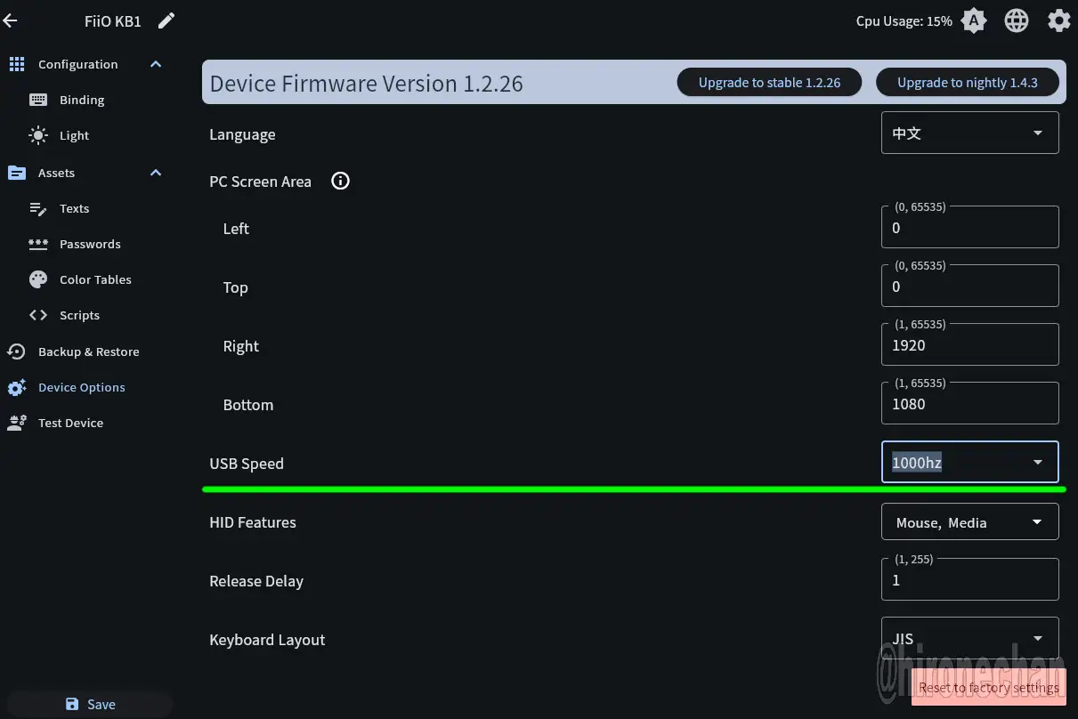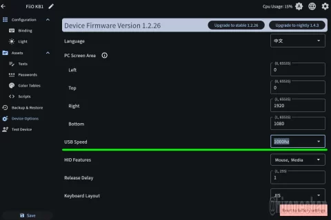 WEBツールの「デバイスオプション」の設定でUSBスピードの項目が1000Hzとなっていて他に変更ができないので、KB1Kのポーリングレートは1000Hzかもしれないです。