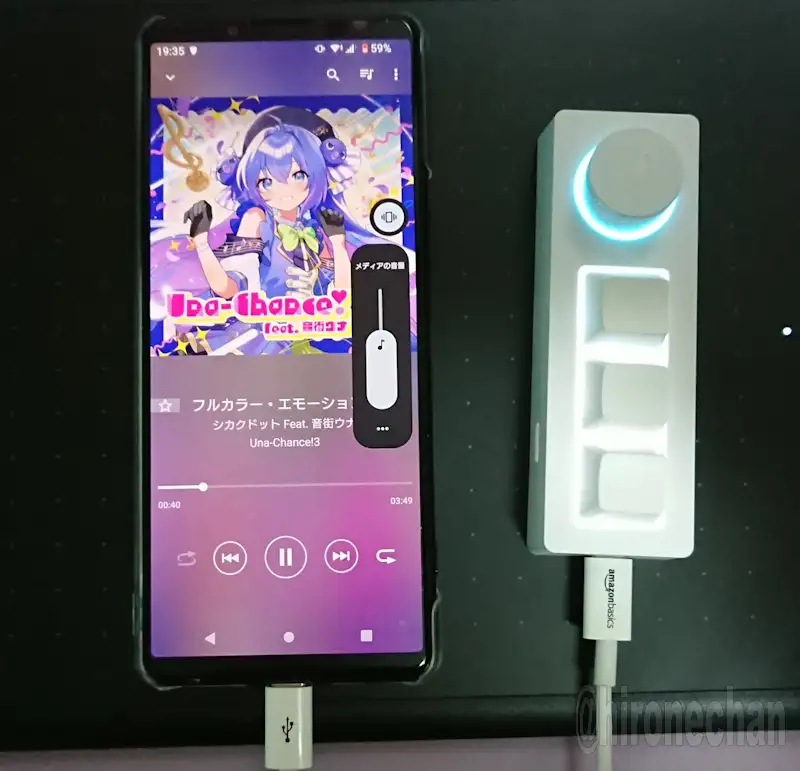 KB1KはUSBタイプC接続なのでスマホに接続すると音量と音楽再生の操作ができます。Xperia 5 ⅢとXperia XZ1 Compactで動作確認。