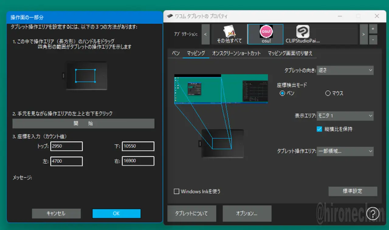 音ゲー「osu」用にワコムのペンタブを純正ドライバで入力範囲を小さく設定しようとすると、計算がややこしいので自分用に簡易計算ツール作りました。