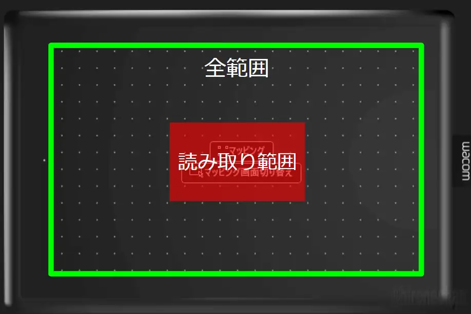 全範囲はペンタブレットの最大読み取りサイズ(横×縦mm)、読み取り範囲は実際に読み取りたいサイズ(横×縦mm)です。