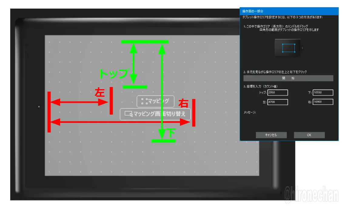 ワコムのペンタブドライバで入力する座標は、それぞれ左辺からと上辺からの距離になります。