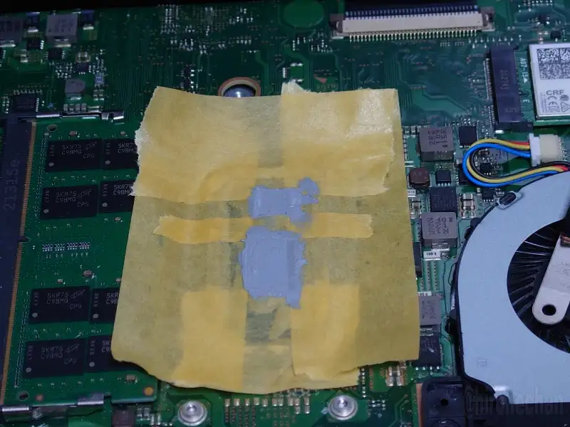 マスキングしてヘラで伸ばして、グリスが石からはみ出たのと縁の部分までグリスが塗られてないですが、どうせCPUのヒートシンク固定圧で伸びるし何度も塗り替えて面倒なのでこのままヒートシンクを取り付け。