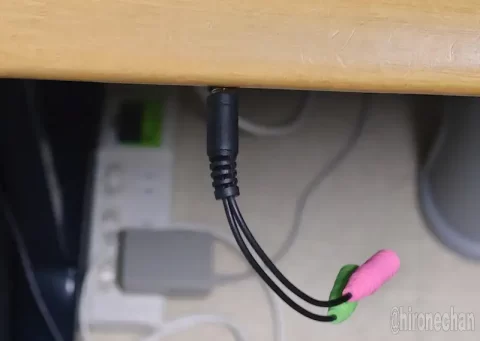 マイク側出力(ピンク)に別のイヤホンを挿してもイヤホン側出力(緑)から音が出ますが、マイク側に挿したプラグで接触不良が起きるとモニターの音量が勝手に変わったりと誤作動します。