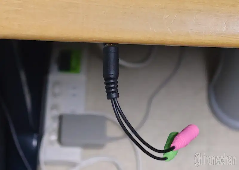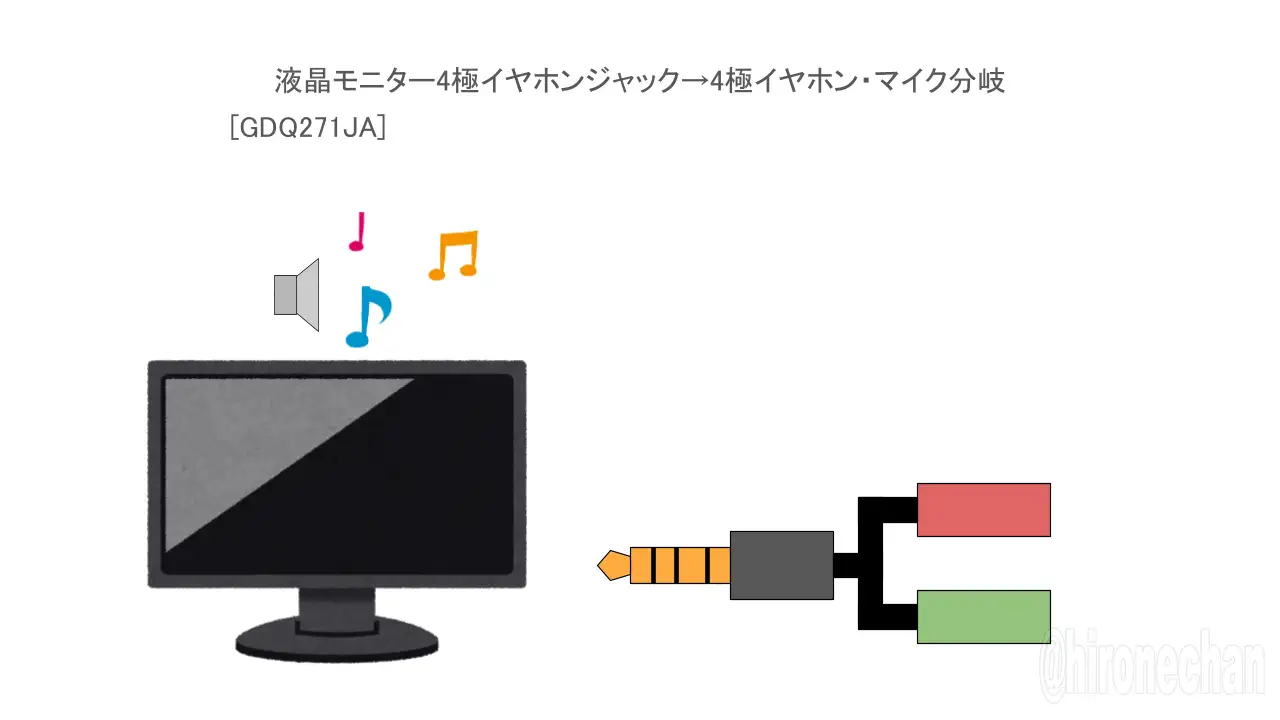 新しいケーブルに変えてモニター誤動作は解決したのですが、購入したケーブルのうち4極延長ケーブルを接続するとモニター内蔵スピーカーから音が出るようになったので、これについても色々ケーブル組み合わせて確認してました。