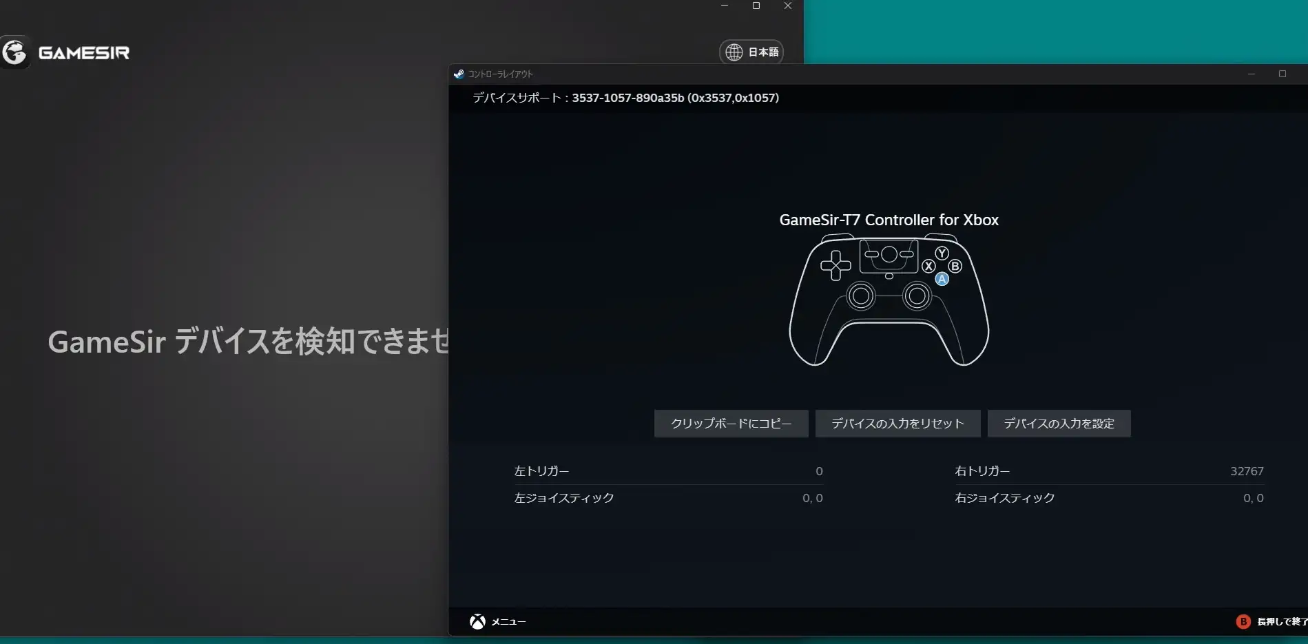通常、パソコンでT7が認識されるとSteamでのデバイス名が「XBOX One」と表記されるのが「Gamesir T7」と表記され、デバイス名が異なるのかそれでゲームでコントローラーの操作が効かなくなったみたいです。