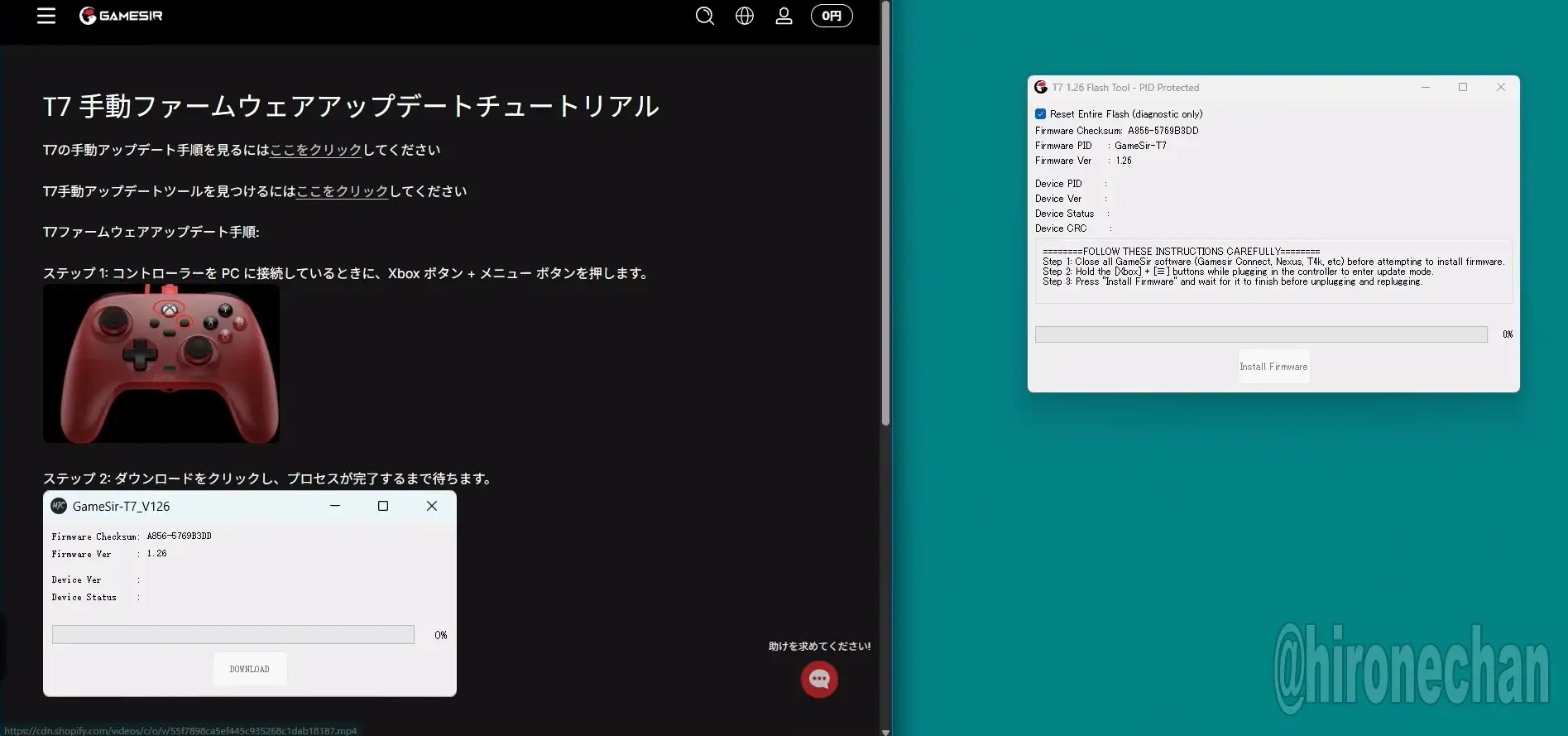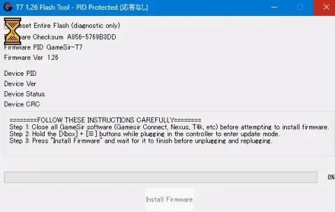 どうやら、GameSir Nexus Legacy開いてたりT7も認識されてる状態だと固まるようなので、GameSir Nexus Legacy閉じてコントローラーもPCから外した状態でもう一度ファームウェア更新ツールを起動します。