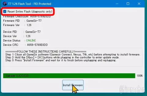 最初「Reset Entire Flash」にチェックを入れずにファームウェアを更新したら、ファームウェアのバージョンが更新されますがGameSir Nexus Legacyで認識しないままでした。なのでReset Entire Flashにチェックを入れてファームウェア更新します。多分ファームウェア全上書き。
