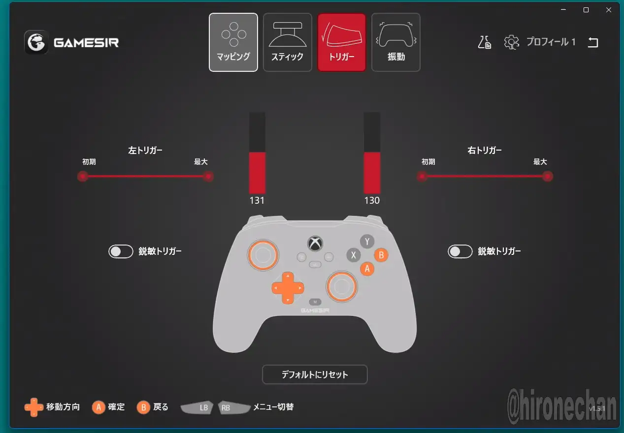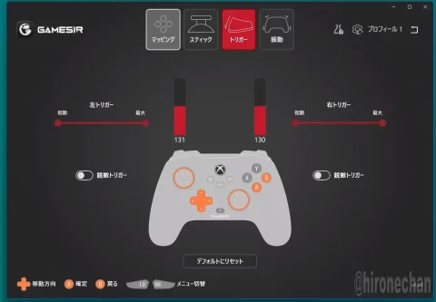 ファームウェア更新したらGameSir Nexus LegacyでT7が認識されるようになり、LRトリガーもアナログ入力が使えるようになりました。