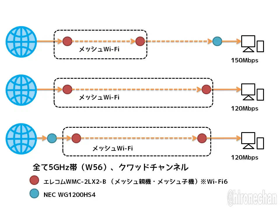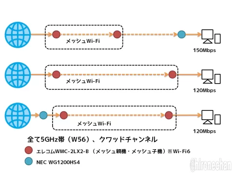 以前と変わらない接続で、中継器モードで使用してるNEC WG1200HS4がエレコムのメッシュ子機に接続してる状態でも150Mbps前後は出るようになりました。