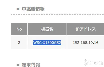 メッシュ親機GST2管理画面から見えるGS2の接続情報