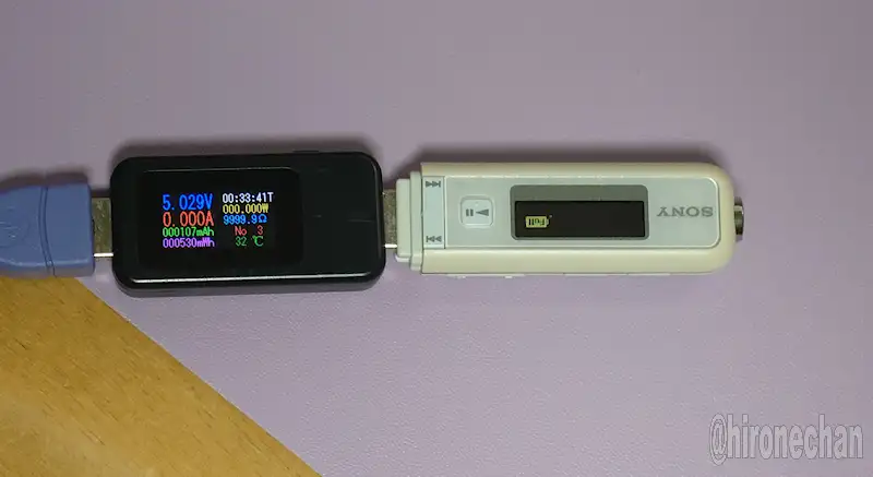 このUSBテスターは3mA未満の電流が測定できないので、テスター測定が止まってからウォークマンで満充電の表示が出るまで5~10分ほど掛かりました。